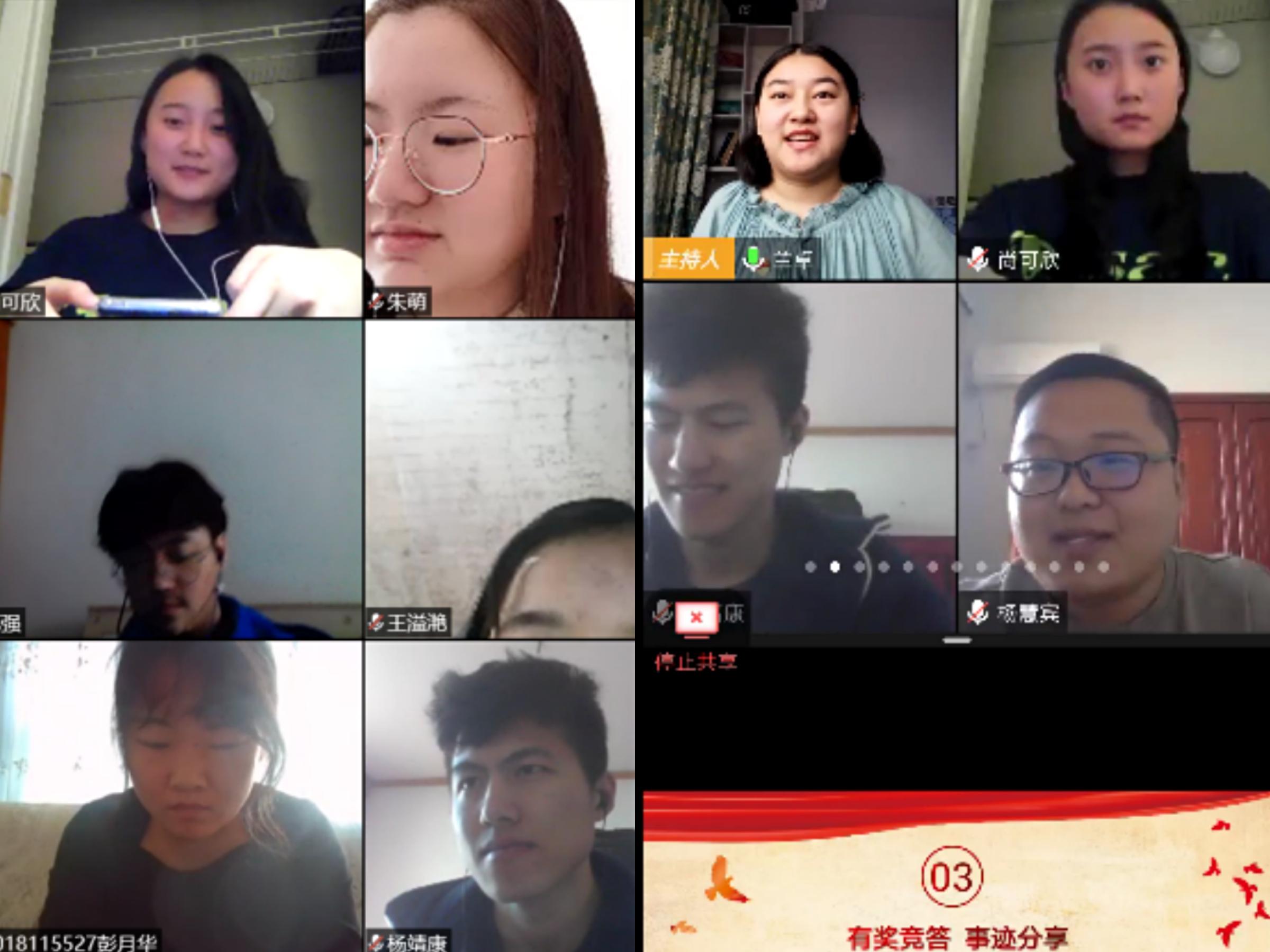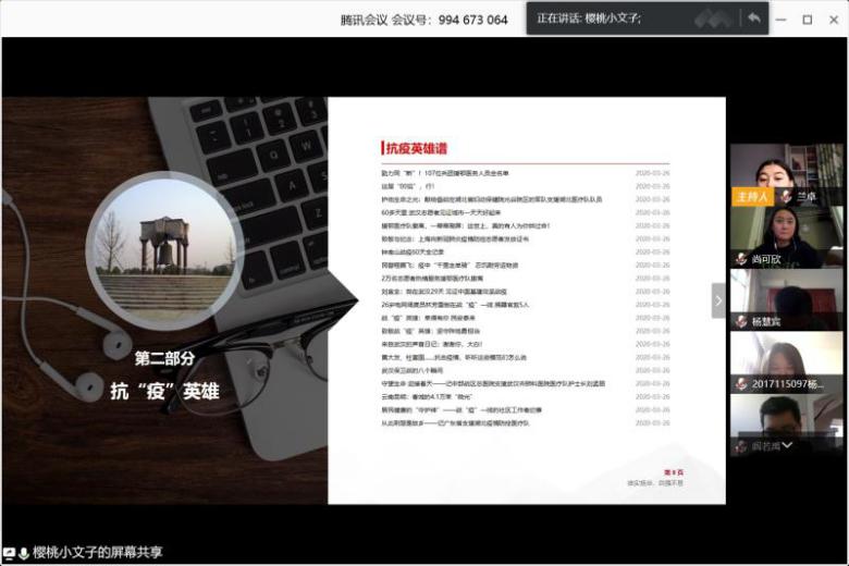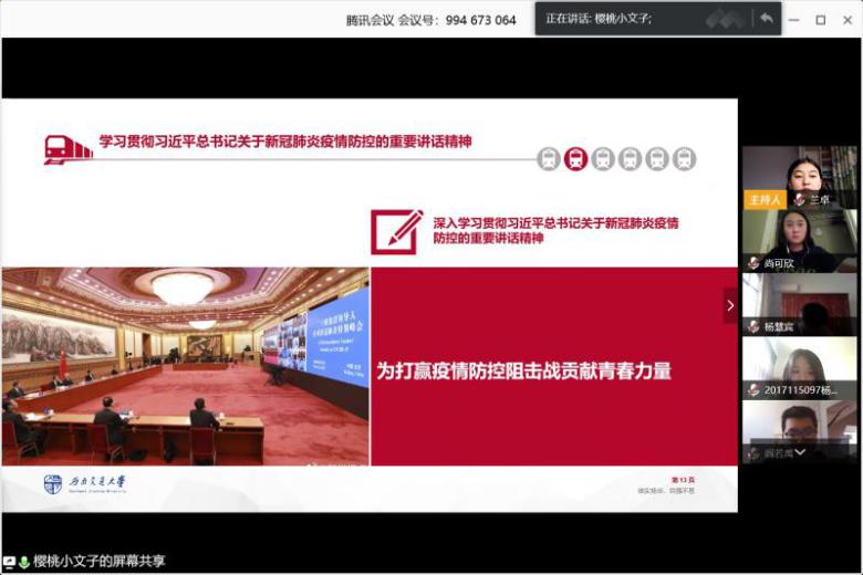 随后,在下一环节中,同学们纷纷发言,分享自己和身边人在抗“疫”期间的事迹。郝博新同志分享了身边朋友在疫情期间挺身而出,参与抗战一线工作的感动;王溢滟同志分享了自己在家乡担当志愿者的所作所为,希望为家乡的抗疫工作贡献自己的一份力量;尚可欣同志作为身处美国亚特兰大的留学生,分享道:中国大使馆积极组织协调,与亚特兰大四所学校的中国学生会取得联系,为在美留学生发放防疫物资,尚可欣同志深切感谢到我国对于留学生的关心,并为作为一个中国人而感到自豪。不管身处何处,国家永远是我们的依靠。