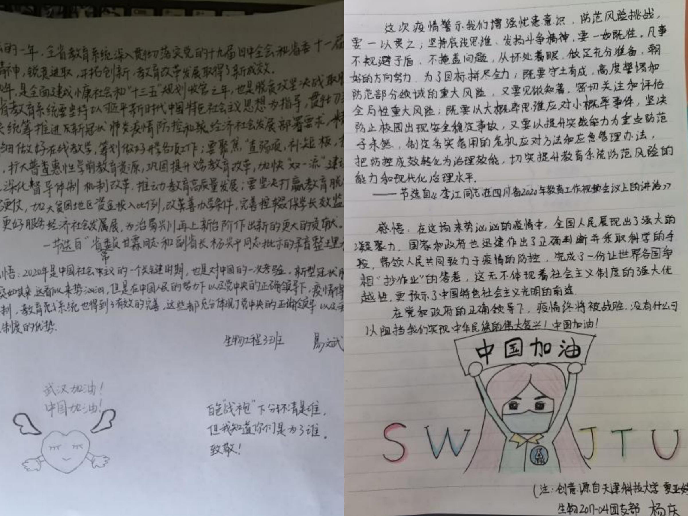 线上会议结束后,支部各位党员同志、积极分子以摘抄、写感悟、配图文的形式认真学习会议精神,贯彻学校党委“抓好疫情防控不放松,抓好各项重要工作不懈怠”的要求。