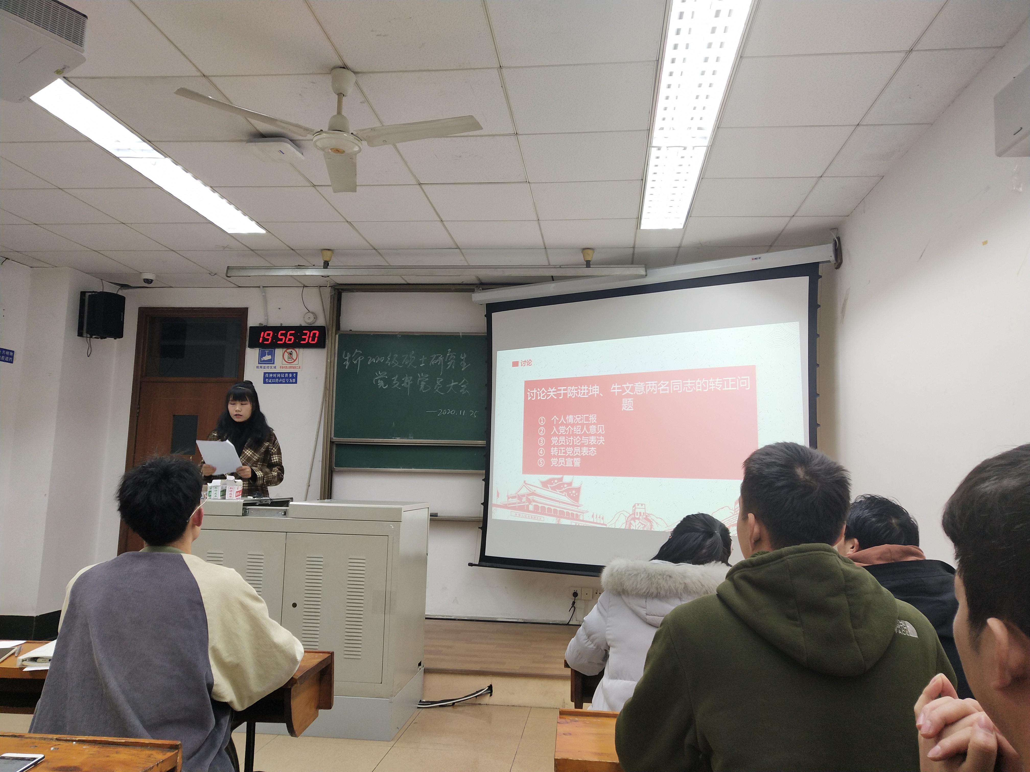 2020年11月25日晚,生命学院2020级硕士研究生党支部在九里校区四号楼4304B教室召开预备党员转正支部大会,讨论并表决牛文意、陈进坤两名中共预备党员能否按期转为正式党员事宜。会议邀请了研究生辅导员兰卓老师和张硕老师参加,会议由支部副书记万珍伶主持。