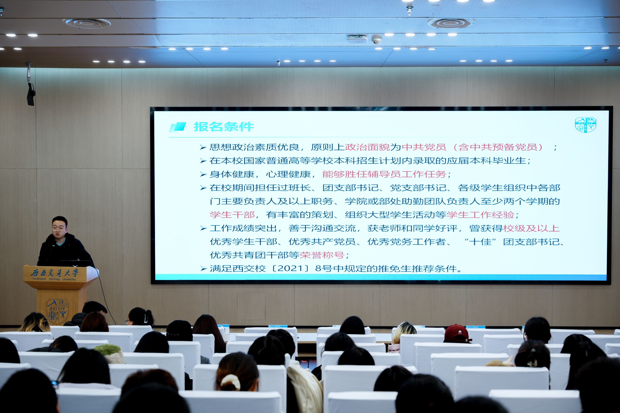 在免研辅导员经验分享环节,学院2025届免研辅导员、青年讲师团成员金鹏帆从日常工作、备考方法、报名时间及材料准备等方面,详细介绍了备考免研辅导员的相关注意事项,最后为同学们带来了就业知识的相关分享。金鹏帆同学建议同学们要结合自身特点,尽早规划尽早行动,脚踏实地一步步向前走。