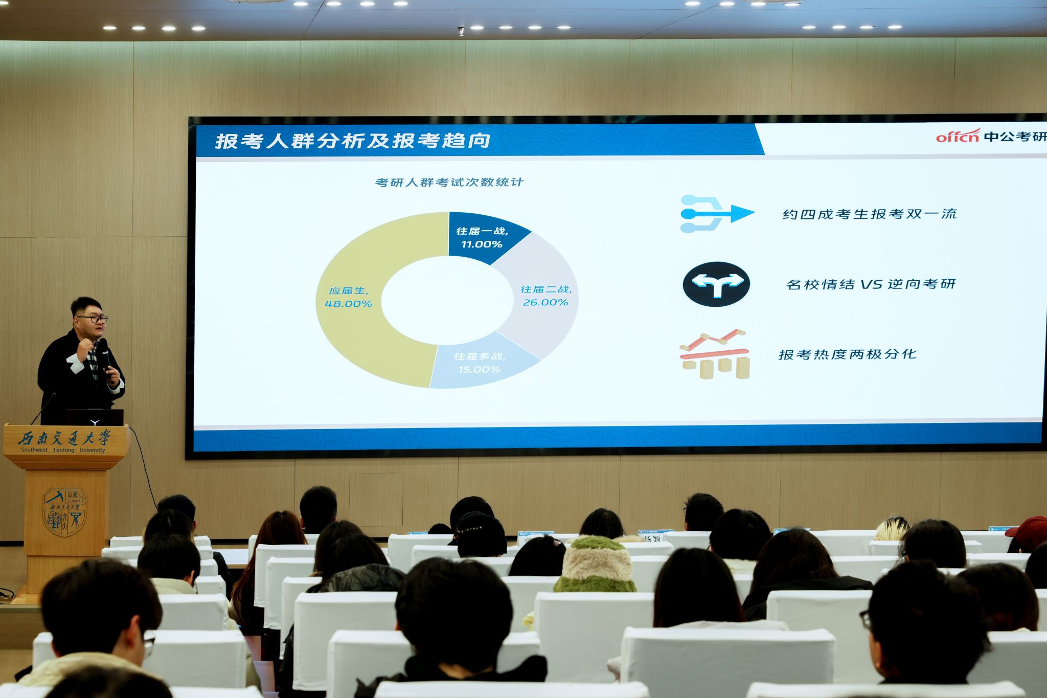校外生涯导师、中公考研教研室主任梁萧老师作了关于考研与考公的主题分享。梁萧老师强调选择比努力更重要,同学们应根据兴趣和职业规划做出理性选择。他还建议同学们结合自身兴趣与未来发展趋势,制定切实可行的备考计划,保持积极心态,为实现目标做好充分准备。