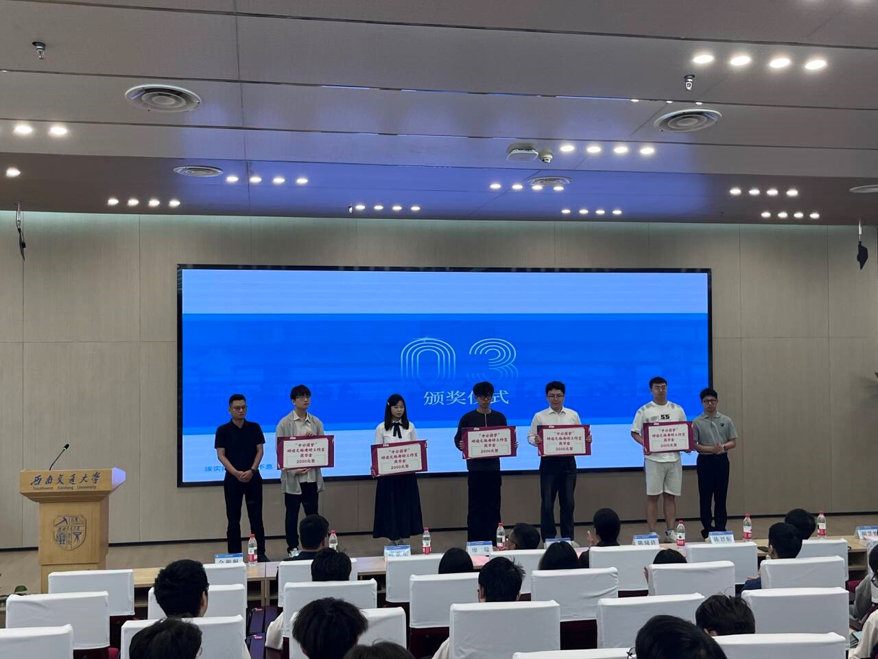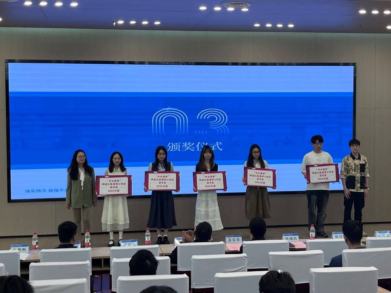 随后,招生就业处生涯教育与就业指导科科长陈曦轶宣读了2025年考研优秀营员名单。黄春蓉、廖瑞、陈曦轶、陈思航、蒋亚东和周桎宏分别为一、二、三等奖学金获得者颁奖。