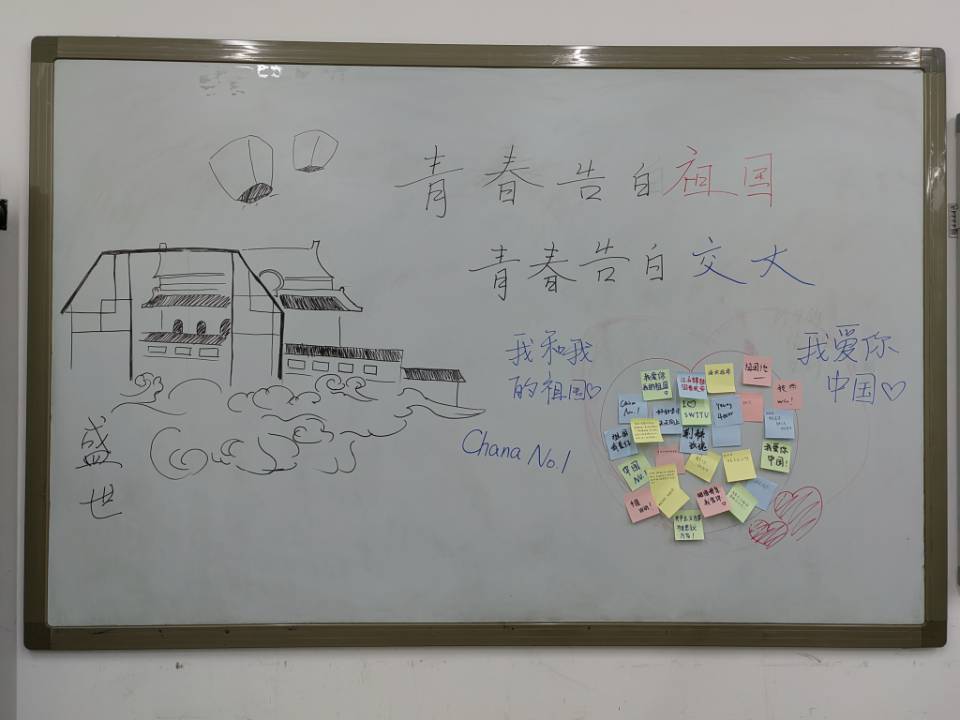 竞赛结束后,同学们又观看了红色影视《守护解放西⟫,了解祖国发展历程,从视频中汲取奋进力量,熔铸理想信念。观影结束,各小组交流感悟,在便利贴上写下对国对党对校的祝福,以最真挚文字抒发最真诚的爱意,并将便利贴粘贴在黑板上,诠释”我爱祖国”和“我爱交大”的深刻内涵。