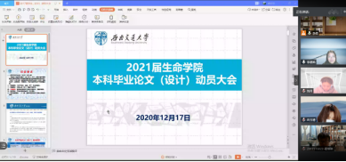 2020年12月17日上午9点,生命学院组织召开了2021届本科毕业设计(论文)动员大会。由于受新冠肺炎疫情影响,按照疫情防控要求,动员大会通过腾讯会议进行,参会人员有本科教学负责人李遂焰副院长、实验中心单连海老师、本科教务员邹远、辅导员李倩以及2021届所有本科生。
