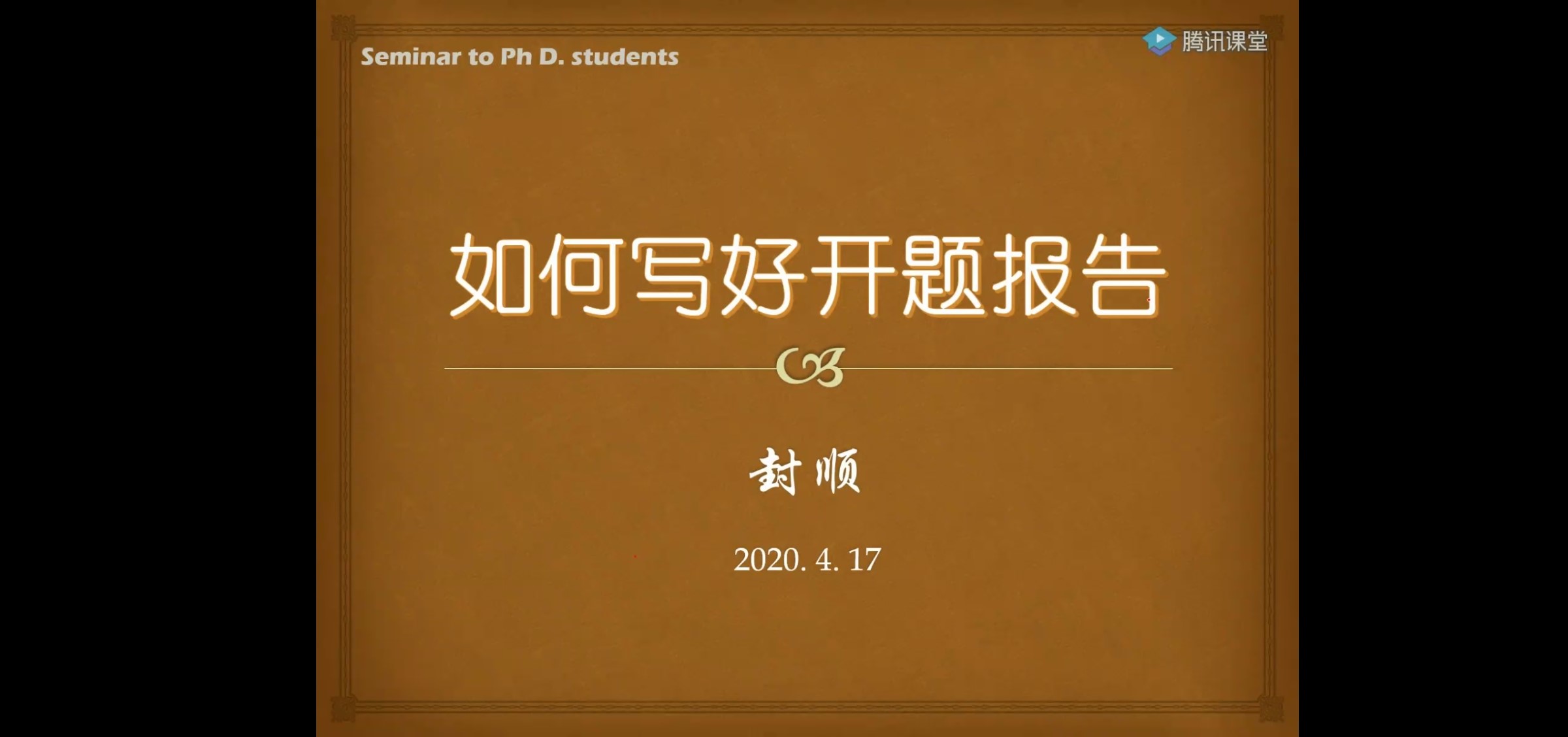 2020年4月17日09:00,以“如何写好开题报告”为主题的博士生学习分享会顺利举行。本次培训会由学院封顺副院长主讲,受疫情影响,本次培训会通过腾讯课堂在线进行。