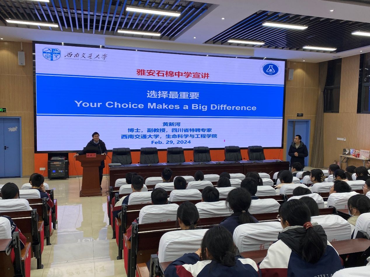 为石棉县中学授牌“优质生源基地”,四川省科技扶贫基金会为石棉中学的50名高中生捐赠10万元“寒门学子大学梦”项目助学金,黄新河副教授以《选择最重要》为题为石棉中学200余名高中学子开展专题报告,生命学院4名实践队员分别深入高三班级开展招生宣讲、高考辅导和咨询答疑活动。