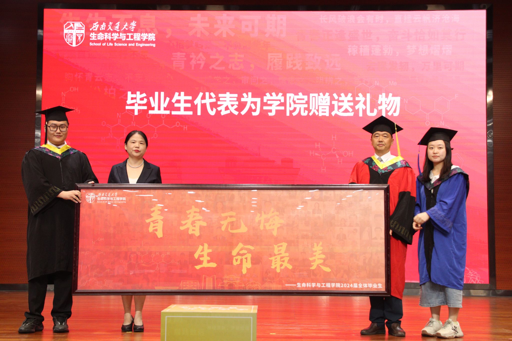 除了学校为每一名毕业生赠送了毕业礼物外,生命学院为2024年毕业生也精心准备了一份“时钟夜灯无线充电台”毕业礼物,学院毕业礼物由杜隆飞校友联系科伦药业赞助支持。这份礼物不仅代表着校友、企业对学弟学妹的关心,更寓意着对大家未来职业生涯的无限期望和祝福。杜隆飞校友、高峰副院长为毕业生代表发放毕业礼物,愿这份礼物陪伴毕业生们开启新的人生篇章。饮水思源,不忘初心。学院2024届毕业生也为学院精心准备了一份由全体毕业生照片组成的“青春无悔,生命最美”礼物,以表达他们对学院的感激之情和美好祝愿。周先礼院长、黄春蓉书记代表学院接受毕业生向学院赠送的礼物。