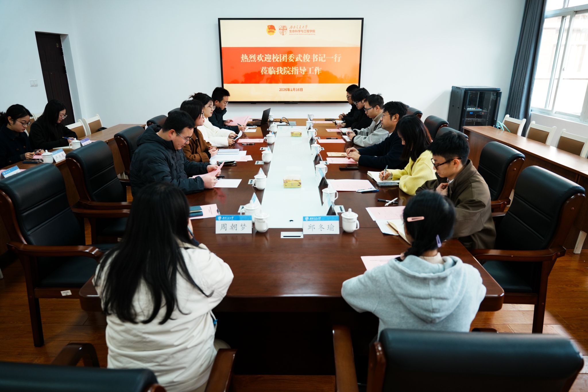 调研会上,学院团委副书记许青代表学院团委作了题为“深耕四力育人,厚植生命底色,扎实推动共青团工作见行见效”的专题汇报。汇报围绕学院共青团“引领力”“组织力”“服务力”“生命力”四力并举的整体思路,从筑牢思想根基、夯实组织基础、助力全面发展、打造工作品牌四个方面,系统阐述了学院共青团工作的实践与成效。重点介绍了学院立足生命学科特色,在思想政治引领、基层组织建设、成长服务、实践育人、科创竞赛、社团建设等方面形成的有效机制与特色品牌。