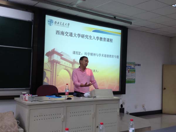 学术道德规范》,就大家关心的引用、抄袭、剽窃等概念做了详细阐释,并通过列举一些虚构科研成果、一稿多投与重复发表、虚假署名与挂名等不道德的学术现象介绍了学术造假的危害。最后,他强调,同学们一定要有科学精神,本着实事求是的态度做学问,坚决抵制不良之风,争做一名合格的研究生。出席会议的王书会副书记就学术道德问题进行了简单地补充。他通过发生在身边周围的真人真事强调了规范学术道德的必要性,同时对同学们提出了要求:一定要恪守学术道德规范,不弄虚作假,专心科研,努力回报社会!