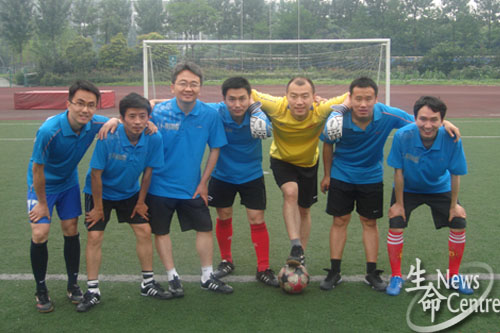 下午18:30,生命学院队和信息网络中心队在小组赛中相遇。随着一声哨响,比赛正式开始。绿茵场上双方队员相互试探,慢慢调动体力,围绕球门巧妙配合,展开了一场斗智斗勇的激烈比赛。双方的进攻和防守都完成得很好,比分一直停留在0:0。略显平静的比赛终于在上半场的十五分钟打破僵局,生命学院的单连海老师依靠积极的拼抢在前场得球,紧接着右脚劲射首开记录。这一进球瞬间点燃了在场观看比赛观众的热情,也更加鼓动了生命学院队的士气。短短几分钟后,生命学院的崔健老师伺机而动,抓住对方后卫失误,再进一球,扩大了生命学院队的优势。随后双方队员你来我抢,多次精彩的配合都威胁着对方的球门,但始终没能继续进球,2:0的比分也保持到上半场结束。在中场休息时段,生命学院的啦啦队上场表演了时尚动感的健美舞蹈,给赛场增添了许多情趣,同时也为双方队员鼓劲加油!