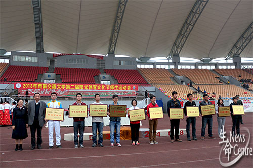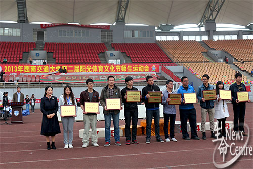生命学院全体师生运动员全力以赴,坚持不懈,最终教职工以总分78分赢得了第五名;学生获得第四名,总分99分。生命学子用欢呼和掌声表达了他们的喜悦。接着校团委副书记曹乔公布体育风采奖,生命学院荣获该奖。入场式生命学院也获得了三等奖的好成绩。2012至2013体育十佳优胜团体中生命学院获得了学生乙组第二名,总分83.47。生命学院学生冯皓获得了十佳个人奖项。最后,进行颁奖仪式。