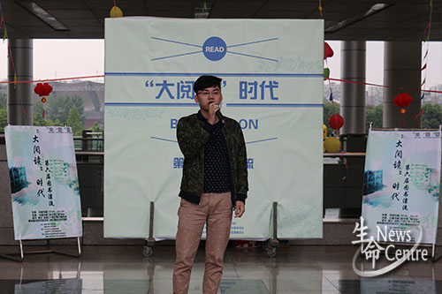 其次,生命学院团委副书记魏源成上场致辞。他首先倡导更多同学参与阅读,享受阅读这场旅行。接着,他认为图书漂流以一种更新颖的方式让书籍更好地传播,使知识传递。最后他希望这个活动能够持续举办下去并祝愿活动越办越好。