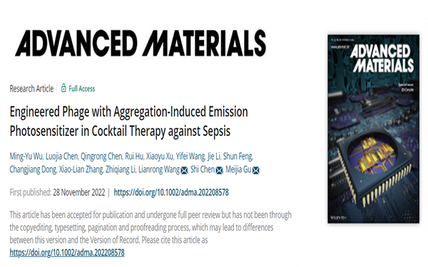 “生命分析技术与材料”科研团队的最新研究成果: “Engineered Phage with Aggregation-Induced Emission Photosensitizer in Cocktail Therapy against Sepsis”,有望为败血症的快速检测和治疗提供切实可行的临床方案。