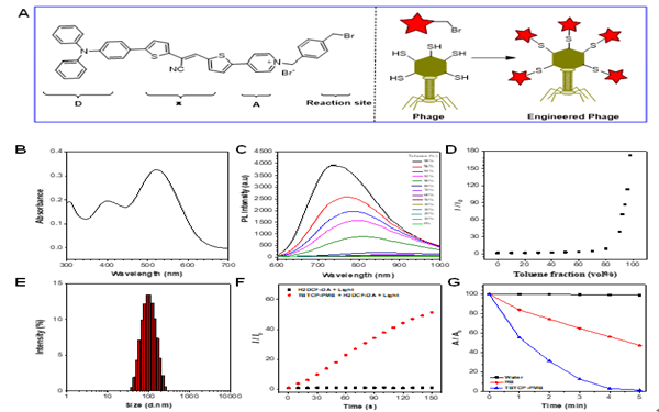 构建典型的D–π–A结构,选择双噻吩丙烯腈作为骨架,引入三苯胺(TPA)作为强给电子基团,吡啶鎓作为强吸电子基团,从而降低单重激发态和三重激发状态之间的能隙,提高系间窜越以提高ROS生成效率。此外,吡啶鎓基团上修饰苄基溴可以与噬菌体的巯基发生亲核取代反应实现噬菌体的共价修饰。实验结果表明,TBTCP-PMB具有典型的AIE特性,显示出近红外(NIR)发射、高荧光量子产率和优异的ROS和1O2生成效率。
