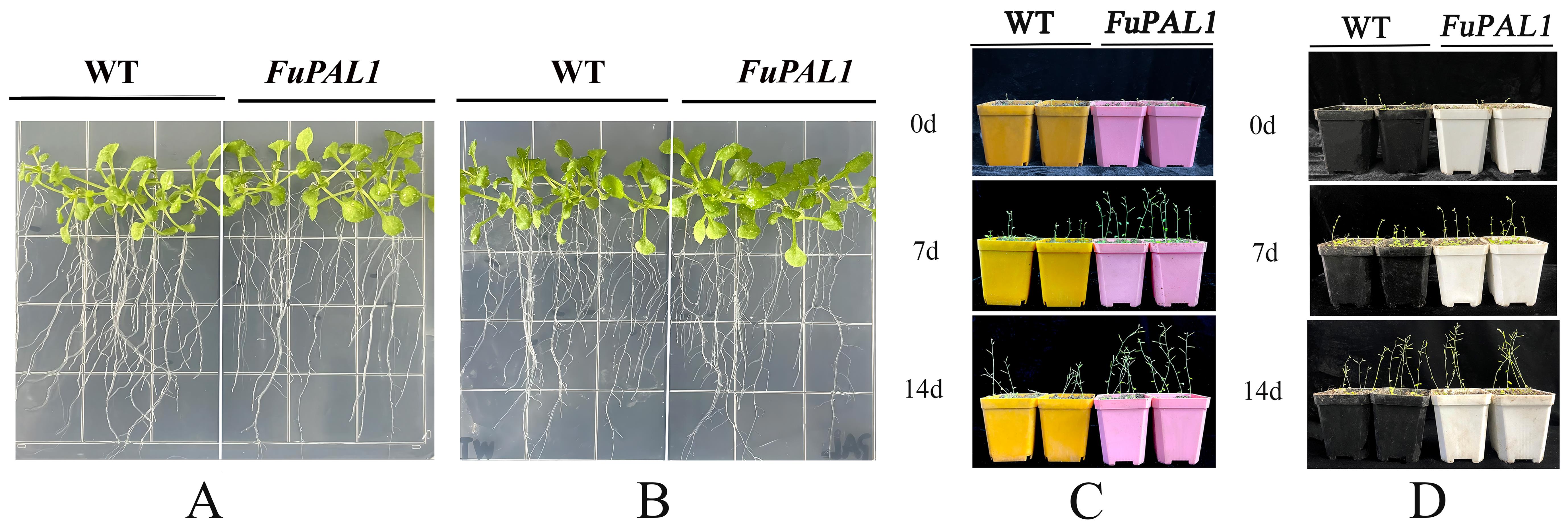 随后,将FuPAL1基因在模式植物拟南芥中过量表达,获得转基因植物。在干旱胁迫处理下,转基因植物在侧根数量、叶面积与植物鲜重等指标明显优于野生型植物,表明转基因植物的抗旱能力更强。同时,相较于野生型植物,转基因植物中的总木质素含量增加了119.49%至128.14%(p <0.01)。干旱胁迫下,野生型和FuPAL1转基因植物的木质素含量分别增加了 142.9% 126.0% ( p < 0.05)。此外,非干旱与干旱胁迫条件下,转基因植物中的水杨酸含量均明显超过野生型植物,范围为 32.58 ug/g 36.68 ug/g(平均值)(p < 0.05)。综合以上数据,表明FuPAL1基因的过表达能够促进木质素与水杨酸的生物合成和积累,其中木质素能够直接提高植物细胞壁的机械强度;而水杨酸作为一种植物防御激素,激活水杨酸信号途径,从而共同提高植物的耐旱能力。以上研究成果,证实了FuPAL1在植物抗旱生理过程中的重要作用,并为其抗旱分子机制的系统阐明奠定了理论基础,同时也为抗旱遗传工程提供了一个有效的候选基因。